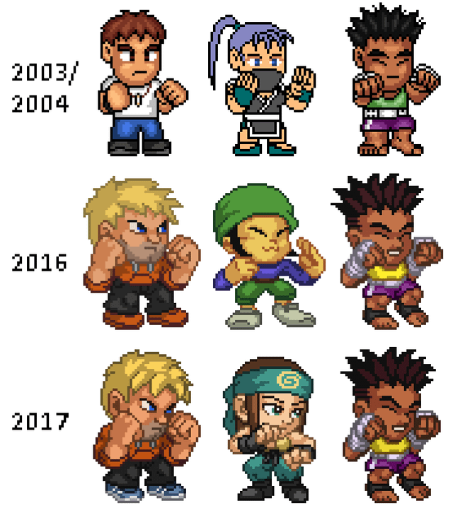 Those early pieces scream "I'm still learning the tools." Inconsistent pixel sizes, too many colors, and that telltale "I'm trying to paint with pixels" look. But watch closely — even here, you can see them starting to understand pixel clusters and basic shading.